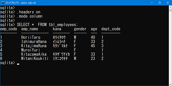 CREATE TABLE tbl_employees (emp_code INTEGER , emp_name TEXT , kana TEXT , gender TEXT , age INTEGER , dept_code INTEGER);