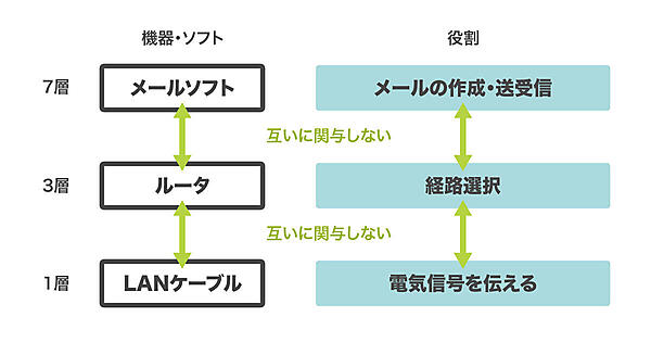 PCのメールソフトが第7層(アプリケーション層)でメールを作成します。メールソフトは、メールを決められたフォーマットで作成するなど、第7層の役割に専念します。このとき、メールソフトは他の層に関与しません。具体的には、第3層(ネットワーク層)で、どのような経路制御をしているのか、第1層(物理層)でどのようなケーブル(光ケーブルやLANケーブル)なのかを全く意識しません。逆に、第1層(物理層)ではLANケーブルなどで電気信号使って相手と通信します。この際、第3層(ネットワーク層)や、メールの中身を作成するアプリケーション層は全く意識しません(そもそも、第1層(物理層)では、上位層でメールを送っているのかインターネットを閲覧しているのかも知りません)。
