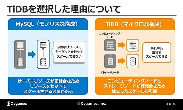 TiDBを選択した理由については、まず「MySQL」を使用しているということを挙げていました。TiDBであれば、MySQLのインタフェースがそのまま使用でき、特にMySQL 5.7との互換性が高く、アプリケーション開発者はバックエンドの仕組みの変更を意識することなく、今まで通り使用できるということで、とても扱いやすいということでした。