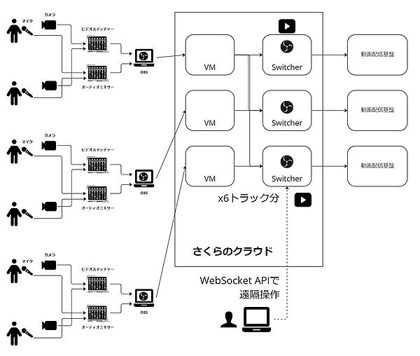 そこで今回試したのが、OBS環境のクラウド化です。さくらのクラウド上に、現地からの動画を受け止めるVMと、OBSを動かすためのVMをトラック数分用意しました。OBSはCPUだけでなくGPUも必要とする重量級のアプリケーションですが、ここにはさくらのクラウドが提供している高火力プランを活用することで解決しました。OBSはWebSocket APIを経由して遠隔操作を可能にし、さらにオペレーターの運用負荷を下げるために専用のコマンドラインツールも開発しています。
