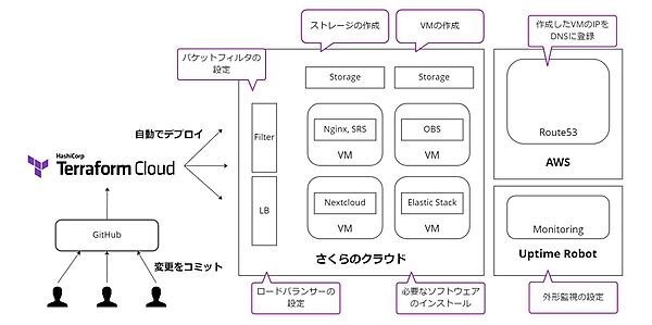 そこで、動画配信作業を行う基盤として、さくらインターネットが提供する「さくらのクラウド」を採用しました。そして、環境を構築するためにHashiCorpが主体となって開発しているOSSであるTerraformを採用し、Infrastructure as Code(IaC)を実現。また、同じくHashiCorpが提供しているTerraform Cloudを使い、限られた作業時間の中でも極めて高度な自動化を実現しました。