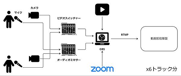 この規模になると、さまざまな問題が発生します。単純に人数が必要になるというのもありますし、OBS環境が全てのキーとなるため配信中には絶対に落とすことができません。十分なネットワークの帯域と性能を割り当てる必要があるのですが、イベント会場は専用のスタジオではなくただの貸しスペースであることも多く、十分な帯域を確保できるとは限りません。足りないリソースの中で、OBS環境が落ちないように祈りながら6トラック分配信を行うのが常でした。