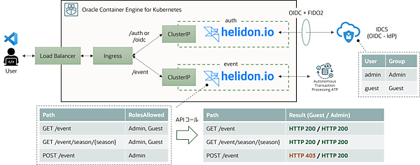 - auth/event のアプリケーションの実行環境として、Oracle Cloud Infrastructure が提供するマネージド Kubernetes サービスである OKE を使用
