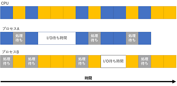 下図は、タイムシェアリングのイメージです。基本は処理中のプロセスを順番に処理しますが、プロセスAのI/O待ち時間の際はプロセスBを実行します。すべての処理が待ち時間のときは、CPUが処理待ちの状態になります。