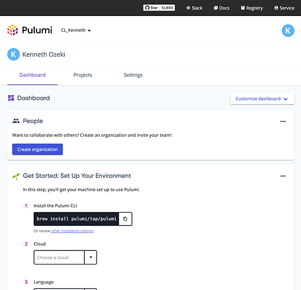 - アカウント登録が完了するとPulumiのダッシュボード画面に遷移します。
