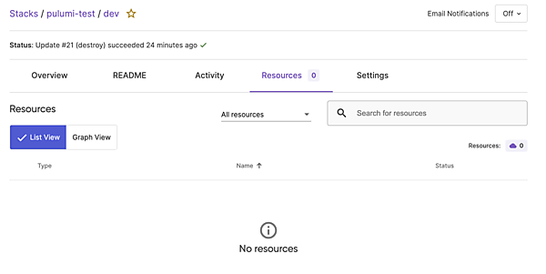 ちなみに、Pulumi Serviceコンソール画面のStack詳細[Resources]タグからも、すべてのリソースが削除されていることが確認できます。