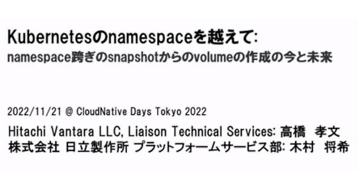 CNDT 2022から、日立のエンジニアがKubernetesのストレージスナップショット機能に対してnamespaceを超えて実行する機能を追加した経験を解説したセッションを紹介する。タイトルは「Kubernetesのnamespaceを越えて: namespace跨ぎのsnapshotからのvolumeの作成の今と未来」という長いものだ。