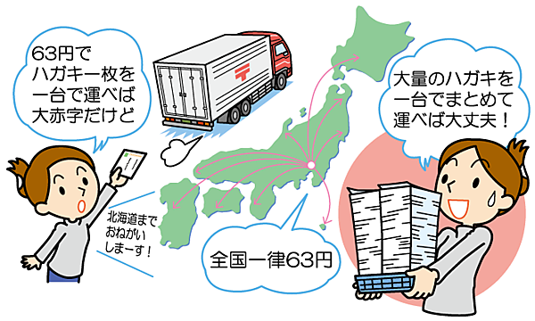 理由はもちろんわかりますよね。いろいろなハガキをまとめて送っているからです。1通のハガキを北海道に送るためだけにトラックを走らせては63円では大損です。しかし、北海道宛ての大量のハガキをトラックでまとめて送ることで、1通あたりのコストを下げることができます。