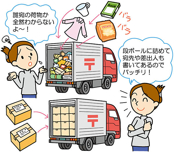でも、次の疑問があります。小包にしても、みんなが同じトラックを共用していれば、どの段ボールがどの宛先の荷物なのかがわかりません。どうすれば良いのでしょう。これらも簡単です。宅配便のように宛名のラベルを書けば良いのです。「差出人」「宛名」「箱の中身」などを書けば、届けたい人にその荷物を届けることができます。