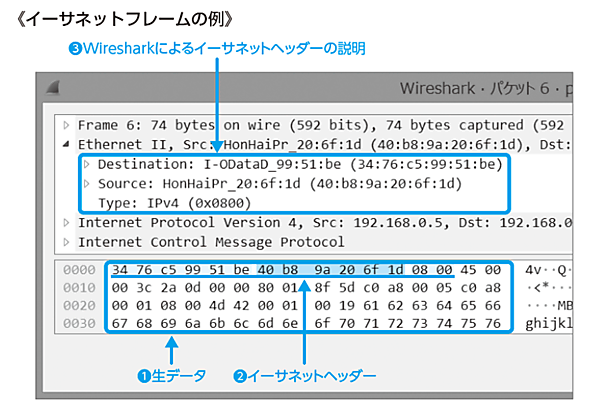❶が生データです。16進数の数字が並んでいます。LANはデジタルデータで通信するため、0と1の信号を送ります。本来は「11010001110110100110010101000110111110…」というデータが流れているのですが、16進数に変換されて「34 76 c5 99 51 be…」と表示されています。そして、実はこれがイーサネットヘッダ(❷)なのです。特に、この34 76 c5 99 51 beという値は、❸にあるようにI-ODataのMACアドレスで、Destination、つまり宛先MACアドレスを示しています。