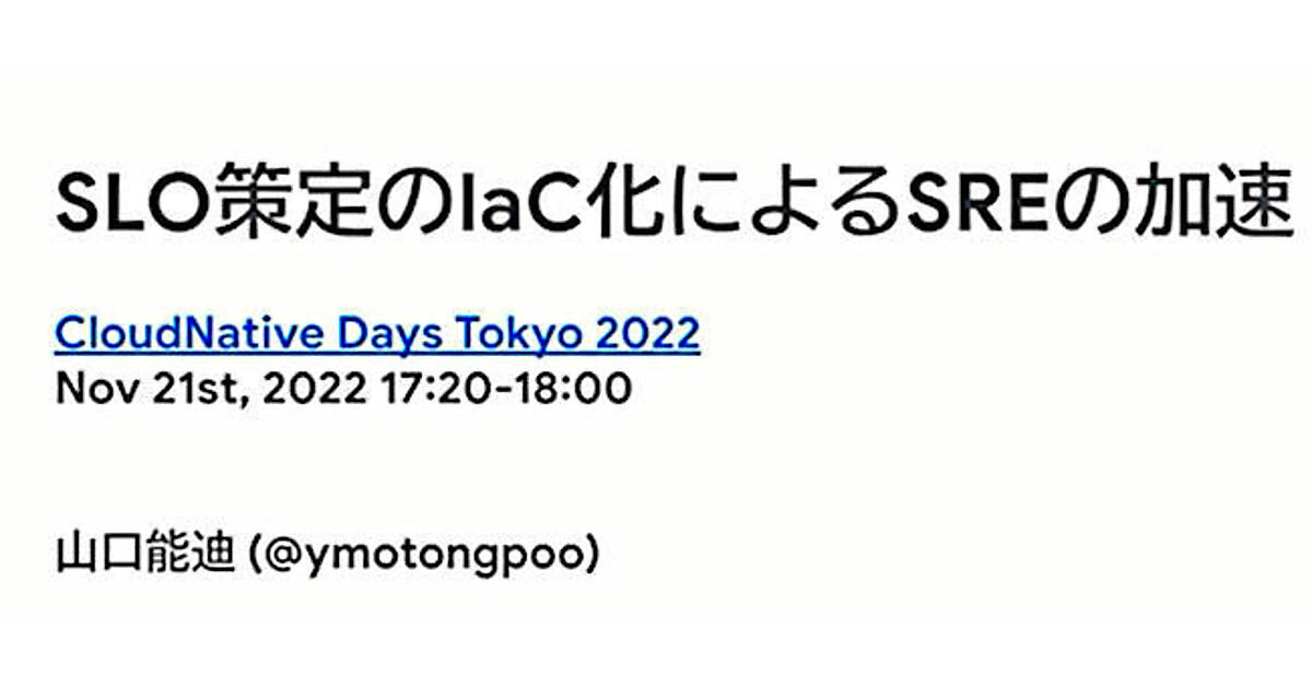 CNDT 2022から、Google合同会社の山口 能迪(やまぐち よしふみ)氏によるセッションを紹介する。タイトルは「SLO策定のIaC化によるSREの加速」となっている。