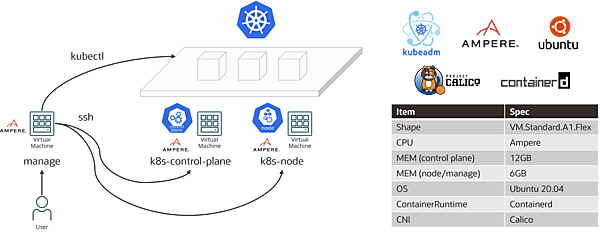 CKSの対策では、発表時のデモを含め、コントロールプレーンとワーカーノードの両方を操作できる環境を準備しました。kubeadmとOracle Cloud Infrastructure(Always-Free)を利用して、以下の環境を構築しました。