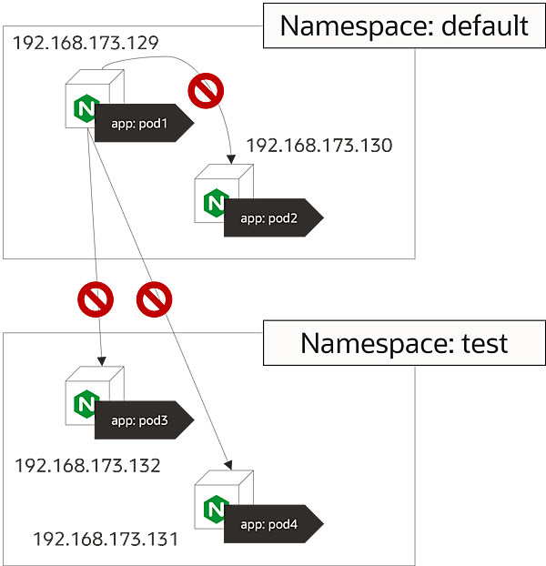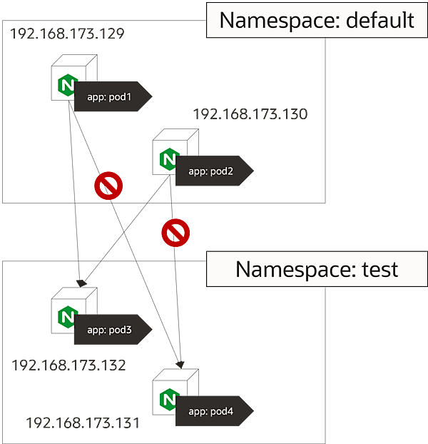 Namespace defaultとNamespace testを作成し各ネームスペースにNginx Podを2個配備して、全ての送信トラフィックを許可、受信トラフィックは拒否するマニフェストを各ネームスペースに適用します。