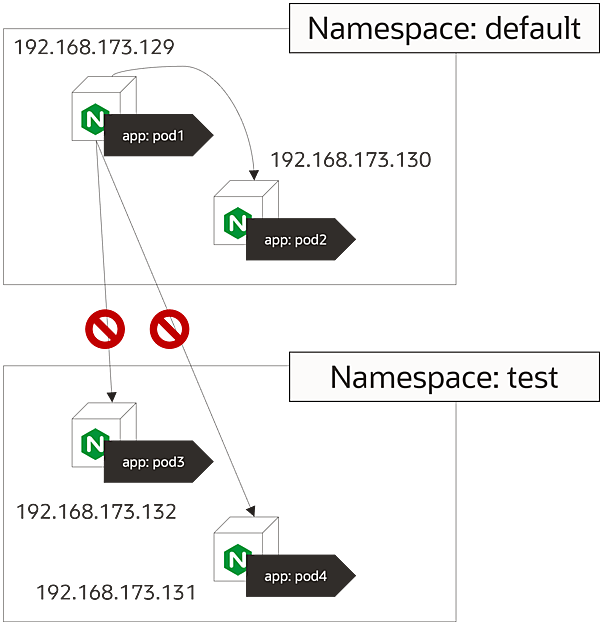 Namespace testにある「app: pod3」のPodは、Namespace defaultにある192.168.173.130のIPアドレスを持つPodからのみ受信を許可するNetworkPolicyを適用します。IngressルールにipBlockを利用した例です。