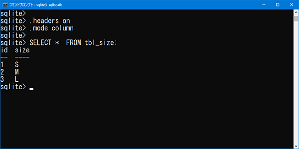SELECT * FROM tbl_size;*「.headers」「.mode」は表示内容の設定コマンドなので、ログイン後に1回実行すればOKです。