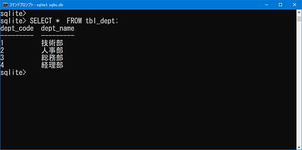 SELECT * FROM tbl_dept;それぞれのデータを確認できたので、実際に2つのテーブルを自然結合で結合してみます。