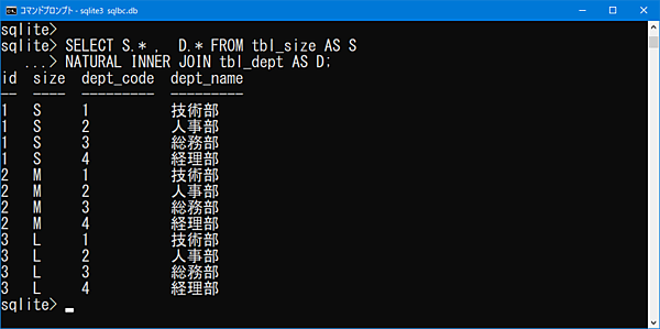 NATURAL INNER JOIN テーブルZ;それでは、前回で登場したテーブルで同じ名前の項目がない、サイズテーブル(tbl_size)と部署テーブル(tbl_dept)を使用して確認してみましょう。データも前回で作成したデータを利用します。今回が初めての方は前回の内容を参照して、それぞれのテーブルを作成しデータを挿入してください。