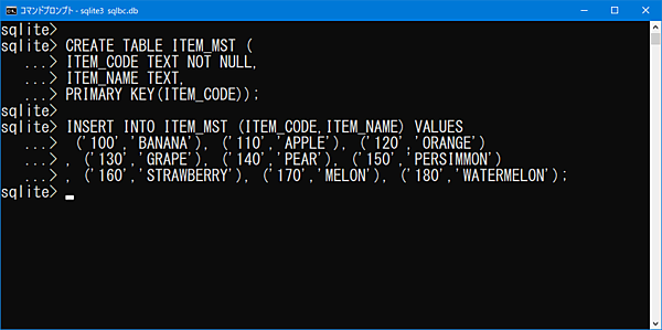 PRIMARY KEY(ITEM_CODE));【商品マスタINSERTコマンド】INSERT INTO ITEM_MST (ITEM_CODE,ITEM_NAME) VALUES