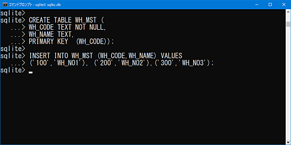 PRIMARY KEY (WH_CODE))【倉庫マスタINSERTコマンド】INSERT INTO WH_MST (WH_CODE,WH_NAME) VALUES