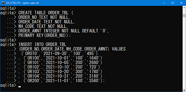 PRIMARY KEY(ORDER_NO));【受注テーブルINSERTコマンド】INSERT INTO ORDER_TBL