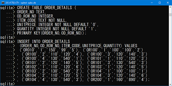 PRIMARY KEY(ORDER_NO,OD_ROW_NO));【受注明細テーブルINSERTコマンド】INSERT INTO ORDER_DETAILS