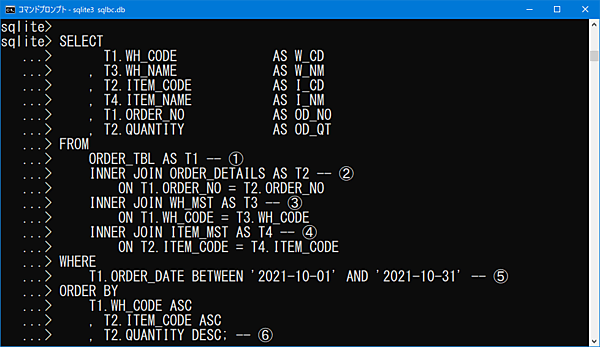 ⑤ BETWEEN句で2021年10月の受注データを絞り込んでいます