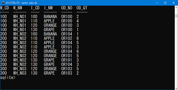 ('100','WH_NO1'), ('200','WH_NO2'),('300','WH_NO3');【受注テーブルCREATEコマンド】CREATE TABLE ORDER_TBL (