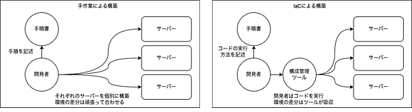 IaCはInfrastructure as Codeの略で、インフラ構成をコードで管理し、構成管理ツールで構築を自動化します。