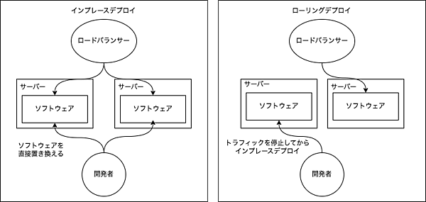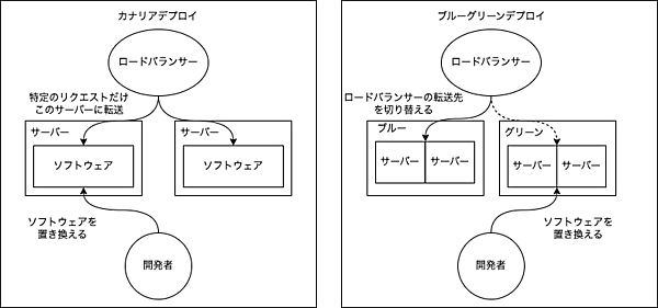 次に、デプロイの手法について考えます。稼働しているサーバーのソフトウェアを直接置き換える「インプレースデプロイ」、稼働中の一部のサーバーを切り離してデプロイし、再びオンラインに戻す「ローリングデプロイ」、稼働中の一部のサーバーにのみ新しいソフトウェアをデプロイし、特定のユーザーにだけ利用してもらう「カナリアデプロイ」、稼働中のサーバー「Blue」と新しくソフトウェアをデプロイしたテスト環境の「Green」をLBのリクエスト転送先を切り替えて一気に公開する「ブルーグリーンデプロイ」などがあります。インプレースデプロイやローリングデプロイはデプロイ先のサーバーを選ぶだけなので仕組みは比較的単純ですが、一方でカナリアデプロイやブルーグリーンデプロイはLBの機能を使って実現しているため、ツールや仕組みが必要になってきます。
