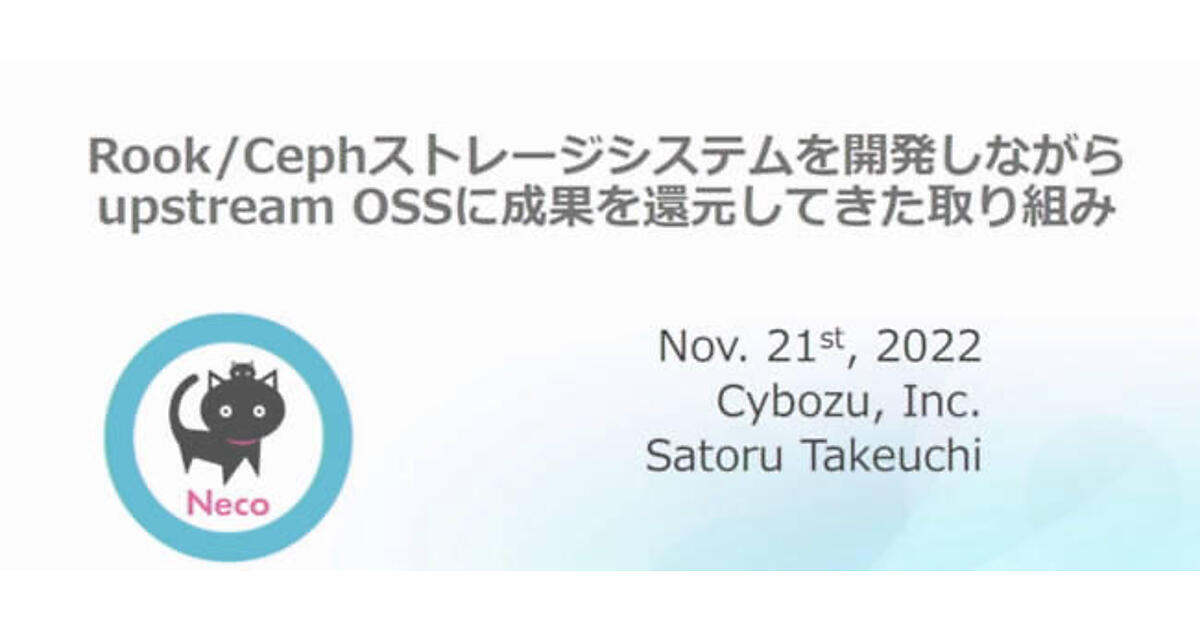 タイトルは「Rook/Cephストレージシステムを開発しながらupstream OSSに成果を還元してきた取り組み」というものだ。前半ではサイボウズが利用する分散ストレージCephとCephをKubernetesから利用するためのオーケストレーターRookを紹介しつつ、後半で実際に遭遇したバグの紹介とその対処方法などを示し、企業内でユーザーという立場ながら、コミュニティの中での泳ぎ方を解説するという内容だ。