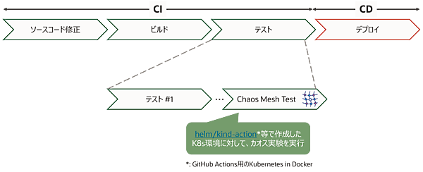 Chaos Meshには、CI(Continuous Integration)の一環として組み込むためのGitHub Actionsがマーケットプレイスで公開されています。helm/kind-actionなどを用いてGitHub Actions上に一時的なKubernetesクラスタを構築し、カオス実験を行った信頼できる資産を各環境に配備することが可能となります。CI上という一時的な環境のため実行できることは限られますが、影響範囲の局所化に対して戦略的なアプローチを取ることができます。