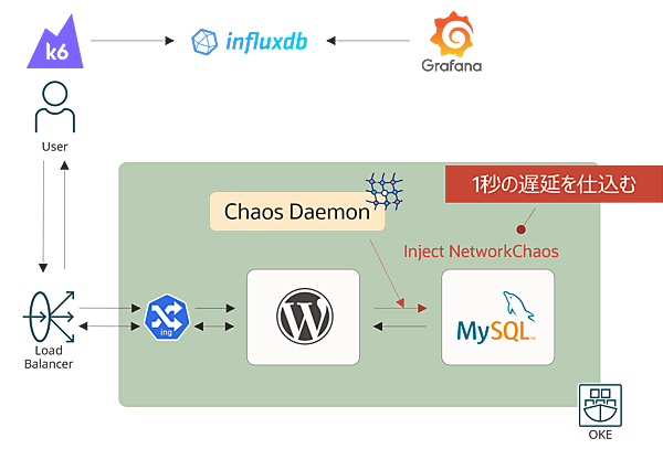 Chaos Meshのワークフロー機能を活用し、k6を用いた定常状態の測定、WordPressとMySQLの間の通信に1sの遅延を注入した際の平均応答時間の測定、Slack通知までを自動化しています。さらに、k6の実行結果とChaos Meshのイベントログを同じGrafanaのダッシュボードに表示することで、イベント注入のタイミングと測定結果の紐づけも分かりやすくなります。