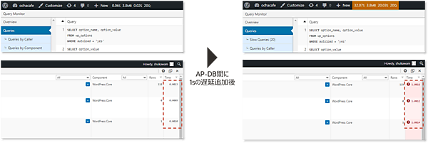 今回のデモでは、該当ページを表示させるために複数回(20〜40回)のクエリーが直列で実行されていることがQuery Monitorで確認できました。そのため、WordPress - MySQL間に仕込んだ1sの遅延は最終的に1s \* 20~40 回 = 20~40sの遅延として観測されます。