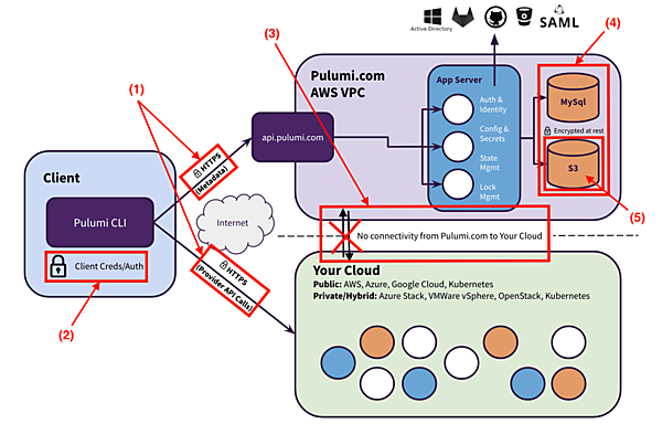- 全てのインターネット経由の通信(PulumiCLI↔Pulumi Service、Pulumi CLI↔管理対象のクラウドインフラ(Cloud APIs))はTLSで暗号化される