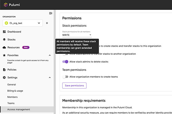 Pulumi Serviceのデフォルト設定では(2023年5月現在)、組織(Organization)レベルで全てのStackに対するRead-write権限が付与されており、組織に所属する全てのチームにそのRead-write権限が継承されています。さらに細かい単位(Stack単位)でチームに権限を設定することで組織レベルの権限設定をオーバーライドさせることもできます。