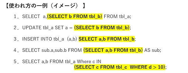 マーカーの部分がサブクエリです。それぞれ、以下の場合で使われています。