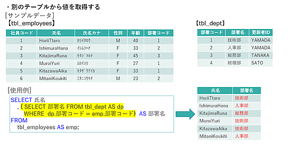 はじめに、SELECT文で別テーブルから値を取得する使用例を確認してみましょう。