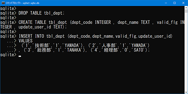 サンプルデータと同様の社員テーブル(tbl_employees)と、部署テーブル(tbl_dept)を用意しましょう。それぞれのCREATEコマンドとINSERTコマンドは以下のようになります。