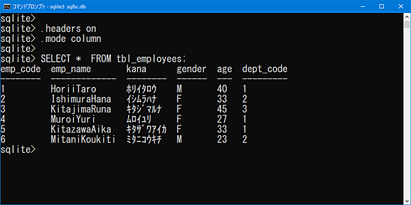 INSERTコマンドで作成した、6件のデータが表示されています。