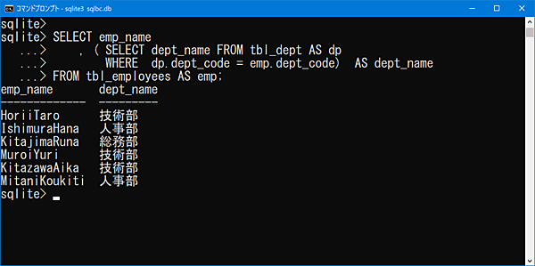 社員テーブルの「dept_code」に一致する、部署テーブルの「dept_name」を取得していることが確認できます。