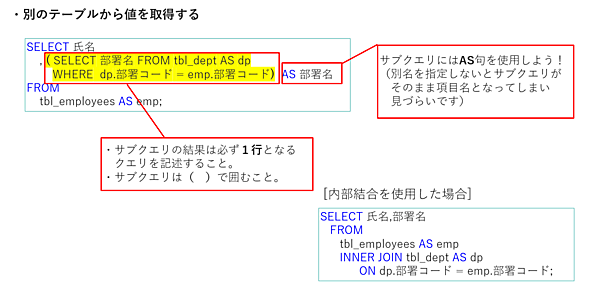 - SELECT文でサブクエリを使用する場合は、結果が見やすいようにAS句を使用して別名にする