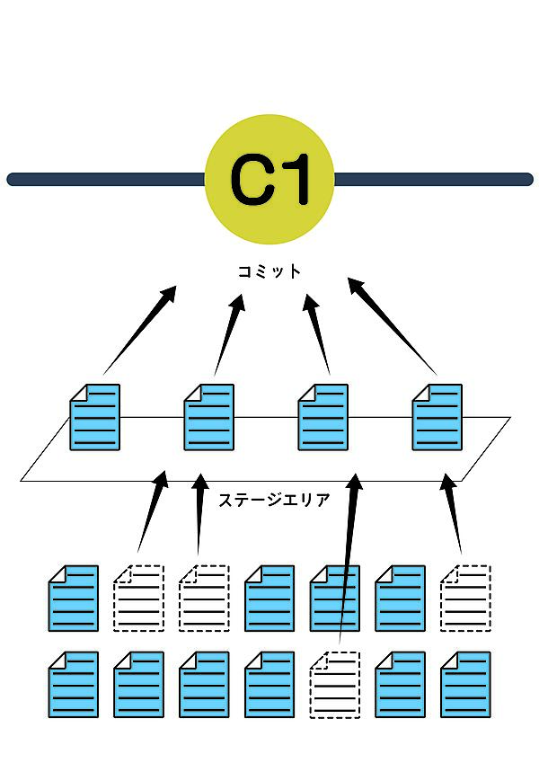 通常であれば何らかのエディタを使ってコードを編集しますが、今回はechoコマンドを使ってファイルを作成します。ファイルの編集が終わったら変更内容を記録します。Gitならではの領域としてステージエリアというものがあります。まずそこに1度変更内容を追加してからコミットする手順(図)となるため、git addを実行してからgit commitを実行します。