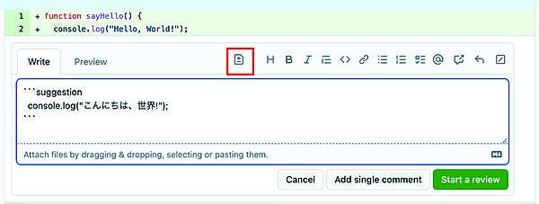 指摘する際にも、提案機能を活用すれば(図)、言葉で事細かく指示せずとも変更後のコードをベースに相手に伝えられます。提案を受けた側も、内容を確認してから問題がなければそのまま新しいコミットとして変更を取り入れられるため、双方がスマートにやり取りできるようになります。