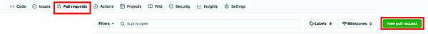 プルリクエストは必ずマージする必要もなく、レビューのみを行ってからクローズするというやり方もできます。プルリクエストを作成するには、GitHubのWeb画面から作成するか、コマンドラインから作成します。Webから作成する場合は、Pull Request > New pull requestから作成することができます(図)。