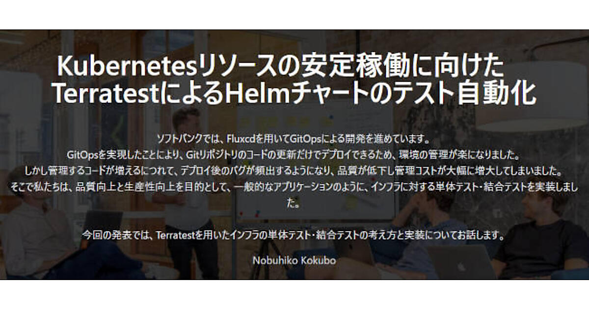 Kubernetesのテストツールについてもリサーチを行っており、KubetestやK6、kube-monkeyなどが対象として挙げられている。ソフトバンクとしてはカスタマイズが可能で単体テスト、結合テストが行えるTerratestを採用したと説明した。ちなみにTerratestはGoのライブラリであり、Goによるプログラミングが必須ではあるものの、カスタマイズ性の高さが評価されて採用に至ったという。