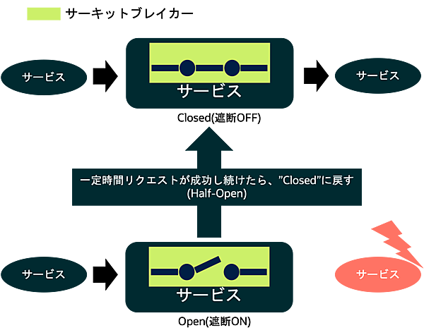 トラフィックの遮断を検知したクライアントはエラーを返したり、最新のキャッシュを返すなどのハンドリングを実施できます。その後、一定時間経過後にHalf-Open(確認中)となります。一定時間リクエストが成功し続けたらClose(遮断なし)となり、障害が復旧したと判断されます。