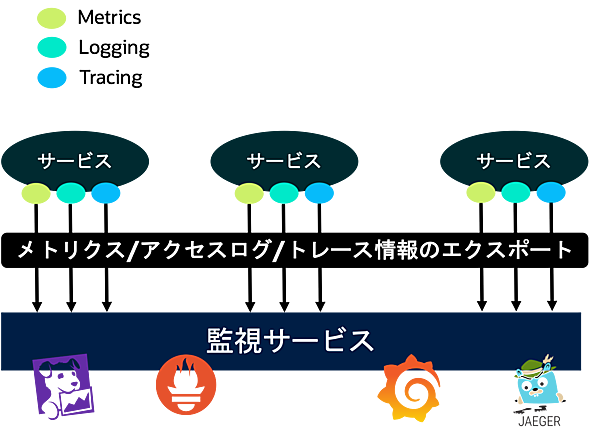 MetricsとTracingは、原則として手動で実装する必要があります。Loggingは、従来通りアプリケーションからログを出力することでカバーできます。ただし、マイクロサービスでは大量の通信が発生するため、その状況を記録するにはアクセスログが必要です。