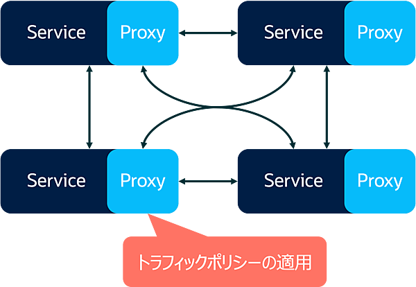 Service Meshは分散システム(マイクロサービス)におけるデザインパターンの1つであり、アプリケーション側に余分な実装を行うことなく、トラフィックの管理をシームレスに実施できる仕組みです。具体的には、各サービス間のトラフィック制御をプロキシにアウトソーシングすることで実現します。