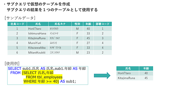 さっそく、FROM句でサブクエリを使用する例を確認してみましょう。FROM句では、サブクエリの結果を1つのテーブル(仮想のテーブル)として扱うことができます。