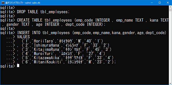 CREATE TABLE tbl_employees (emp_code INTEGER , emp_name TEXT , kana TEXT , gender TEXT , age INTEGER , dept_code INTEGER);【社員テーブルINSERTコマンド】INSERT INTO tbl_employees (emp_code,emp_name,kana,gender,age,dept_code)